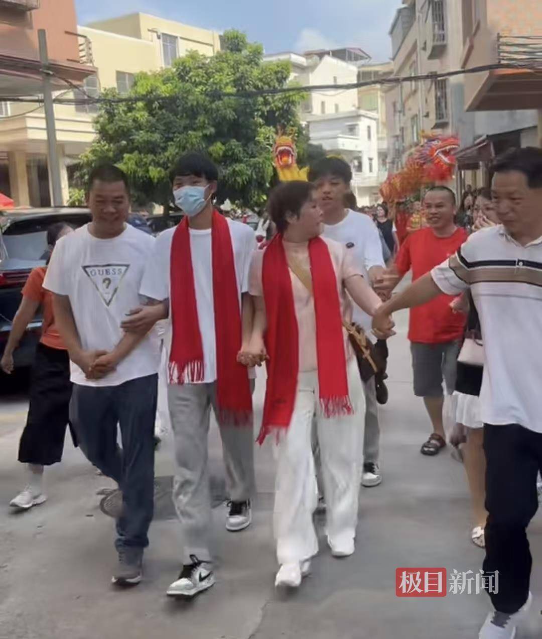 认亲现场,爸爸为叶锐聪戴上了沉甸甸的金项链。母亲邓惠东拉着儿子的手说,“保佑我儿子平平安安,顺风顺水,以后学业进步,保佑我儿子健健康康,奥力给,加油!”